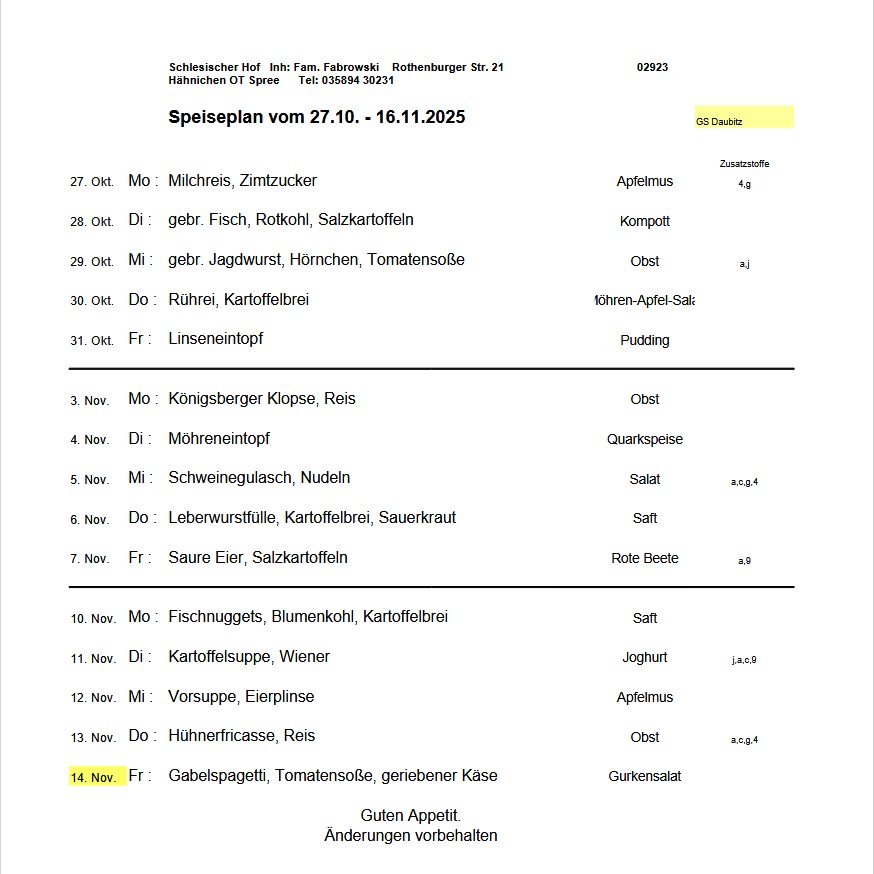 Die Einstellung des Speiseplanes ist erst möglich, wenn wir den Plan von Fa. Fabrowski bekommen.