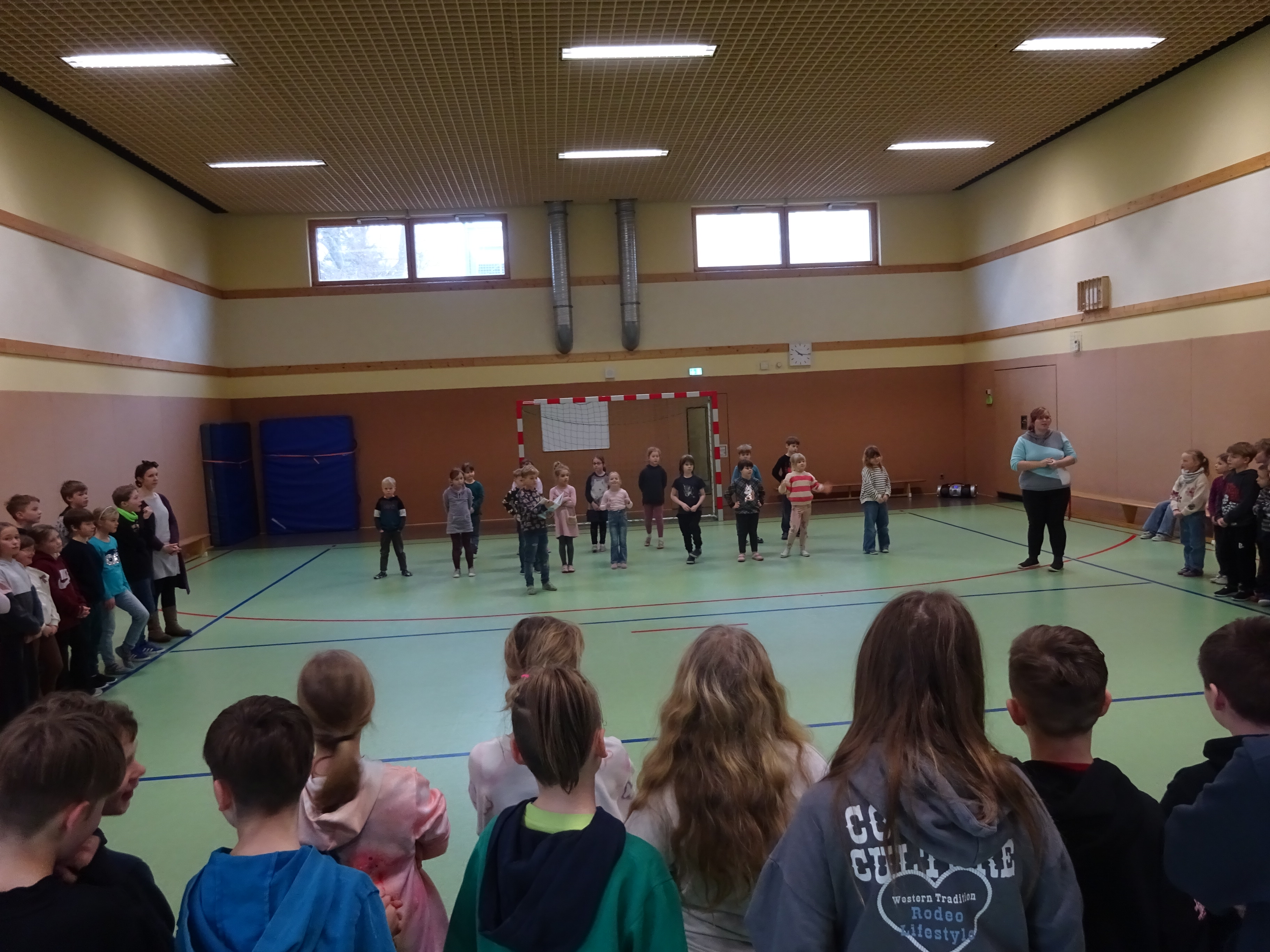 Heute startete die erste Klasse mit "Showtime", d.h. eine Klasse führt eine kleine Darbietung allen Kindern der Schule vor.